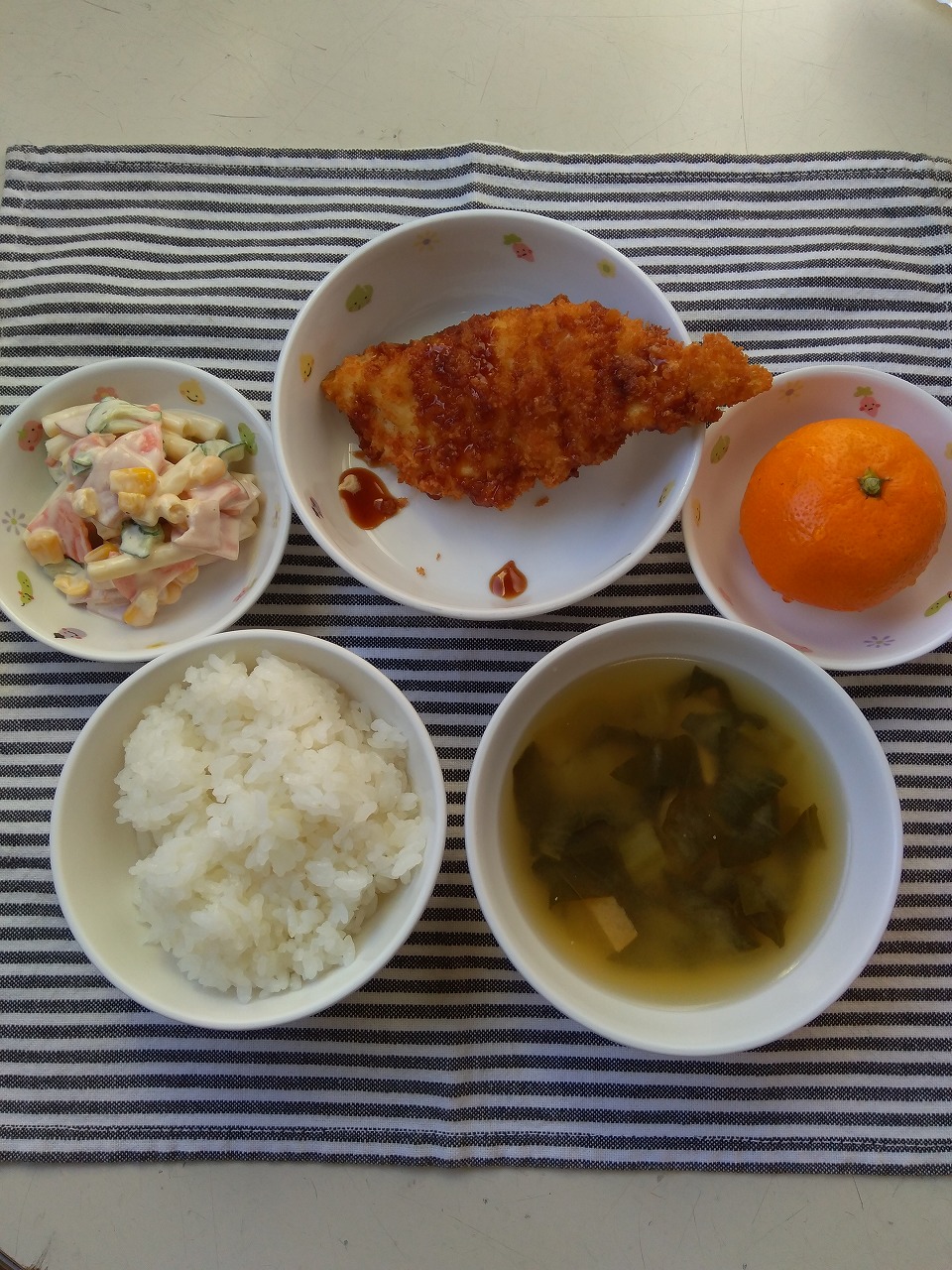 バターコーンご飯 鶏肉と野菜の甘酢煮 みそ汁 果物