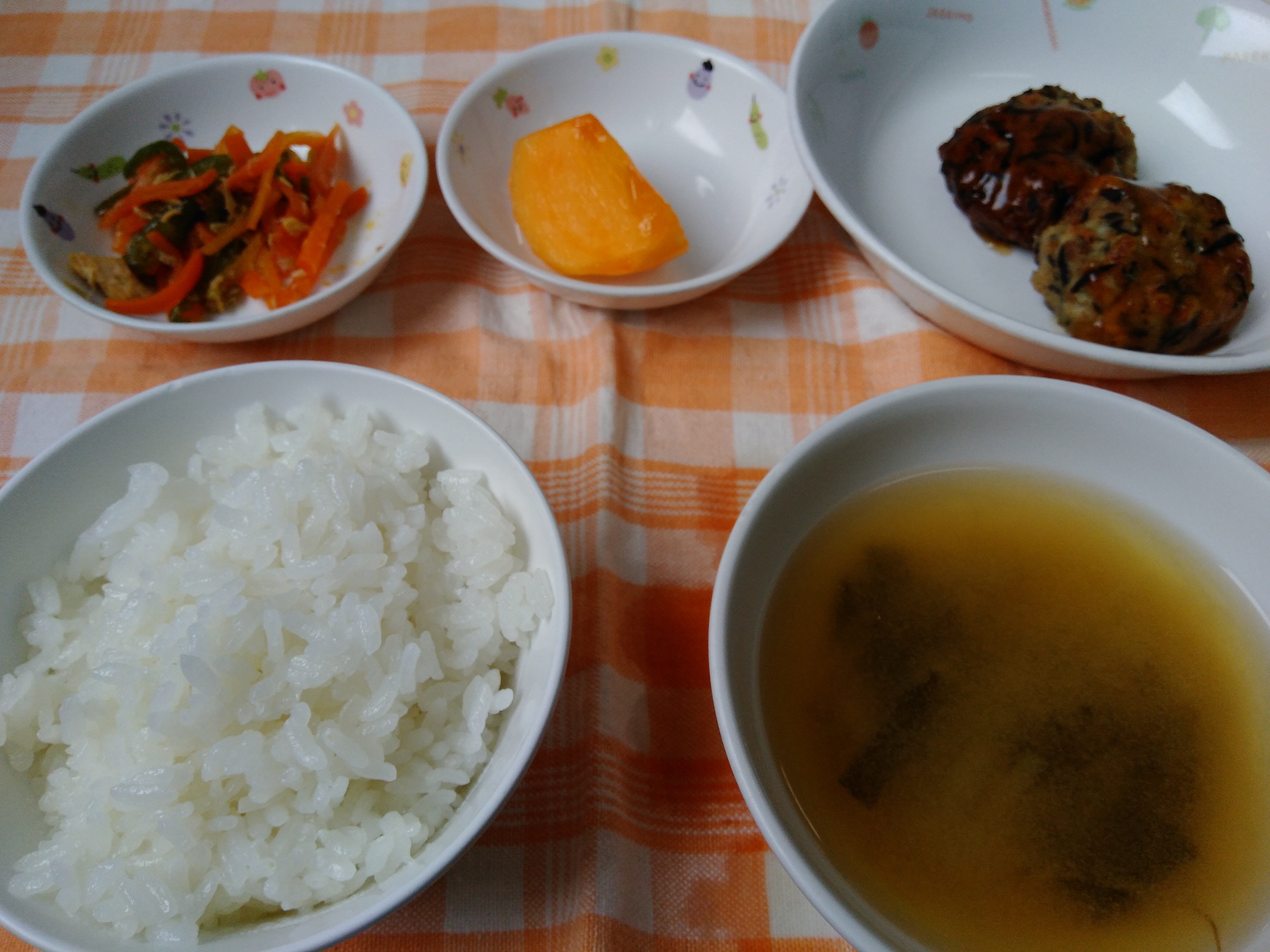 ご飯 豆腐ハンバーグ にんじんしりしり みそ汁 果物