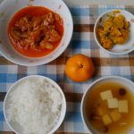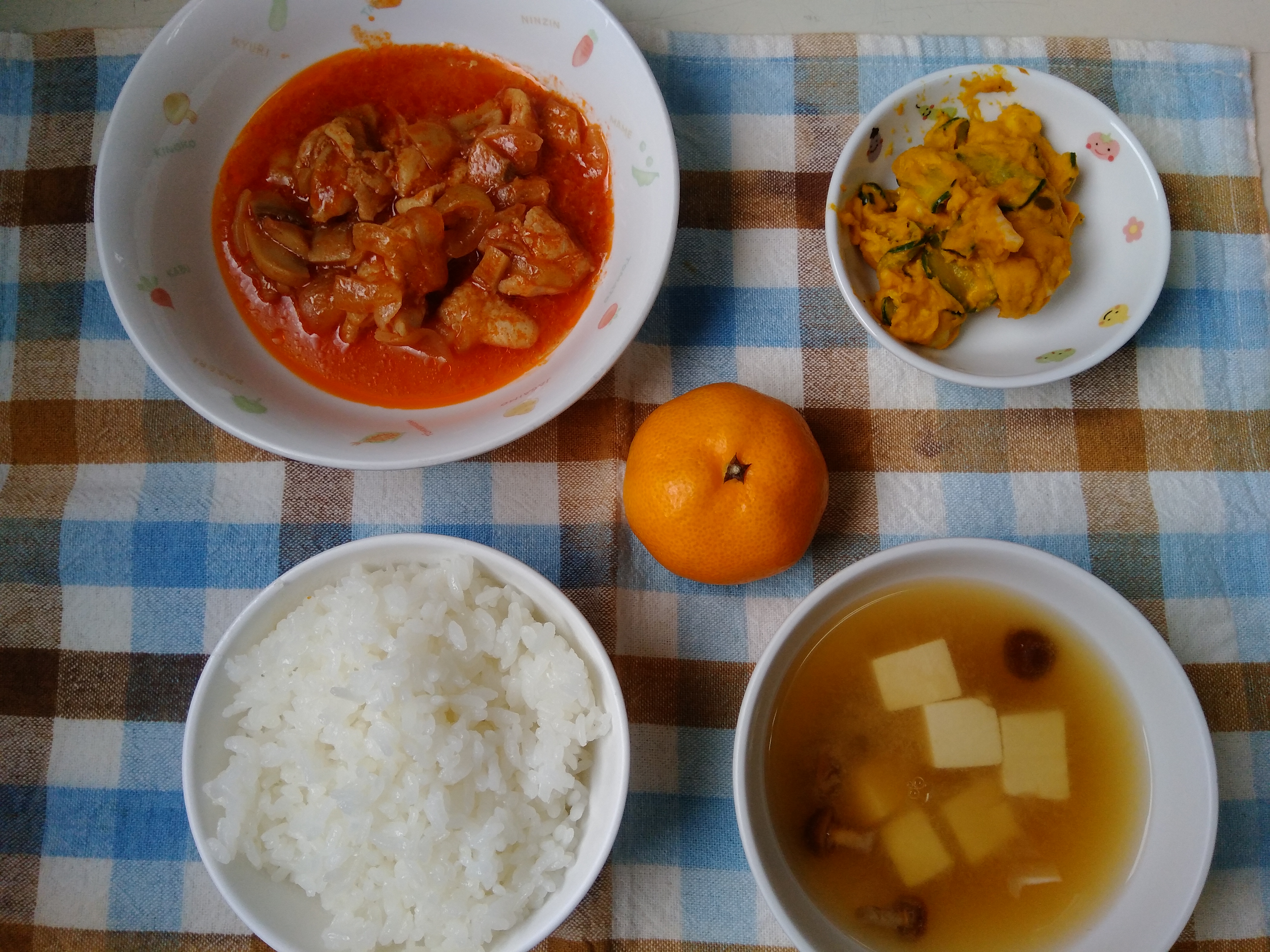 ご飯 鶏肉のオニオントマト煮 かぼちゃサラダ みそ汁 果物
