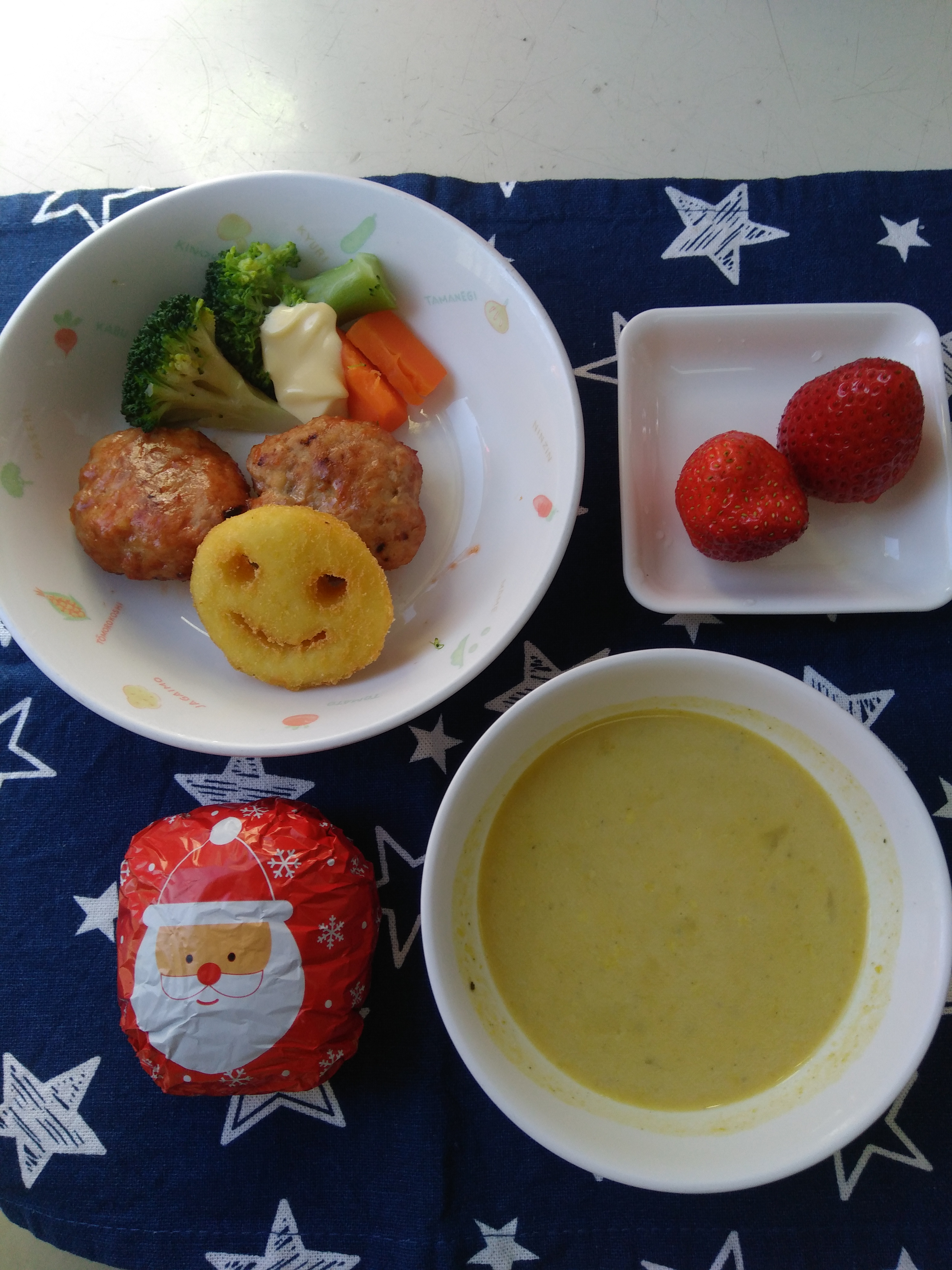 おにぎり ハンバーグ ゆでやさい かぼちゃスープ いちご
