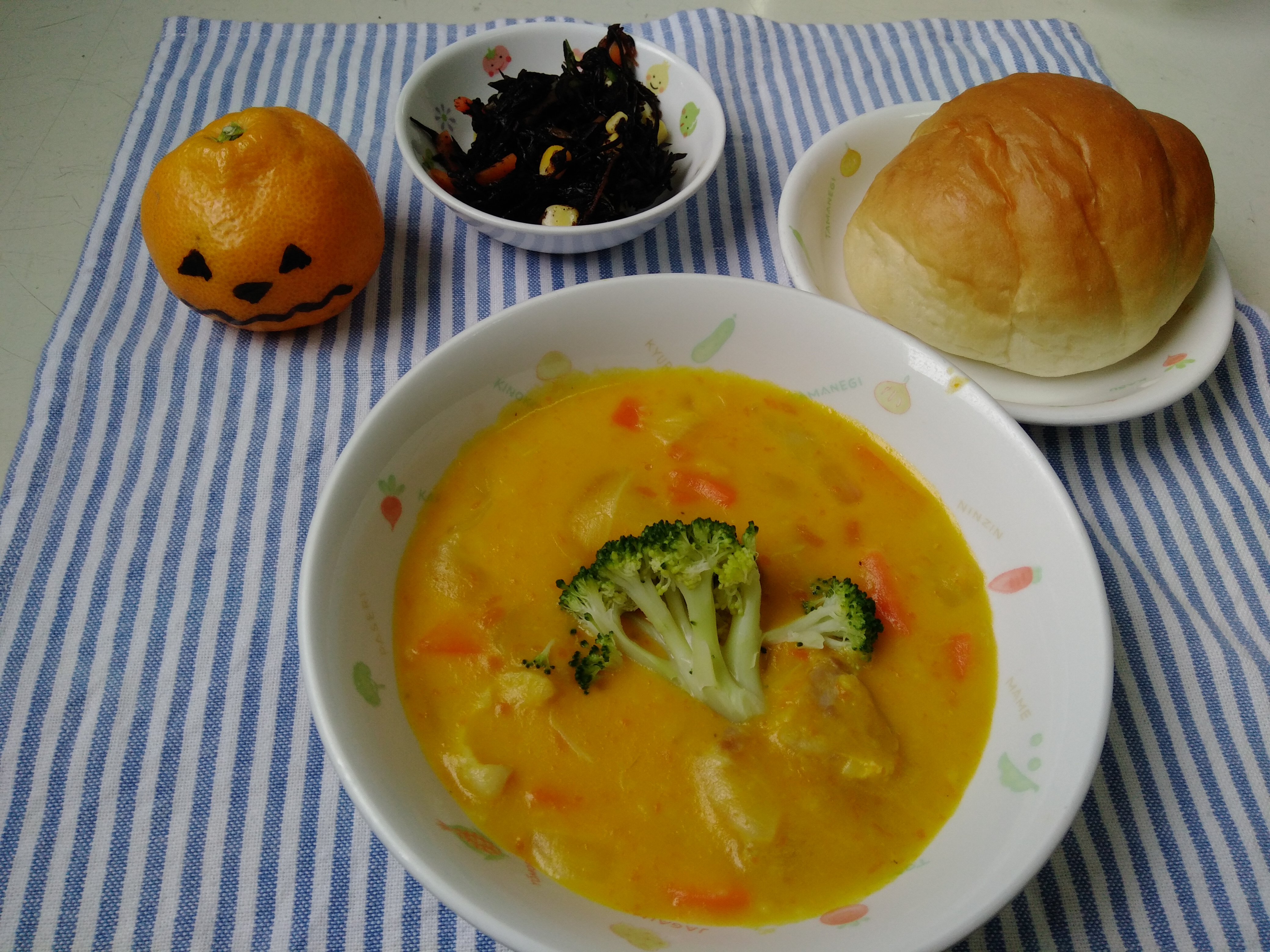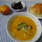 ロールパン かぼちゃのシチュー ひじきサラダ 果物