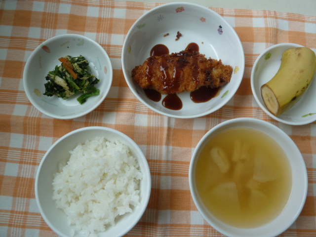 ご飯 魚のフライ ほうれん草とササミの胡麻和え 味噌汁・果物